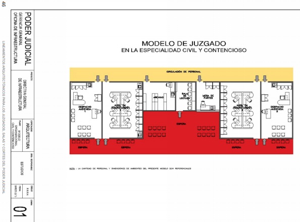 La presente son modelos y medidas extraídas del libro: “LINEAMIENTOS ARQUITECTÓNICOS PARA LOS JUZGADOS, SALAS Y CORTES DEL PODER JUDICIAL”, del Fondo Editorial del Poder Judicial 2014, los mismos que son:
